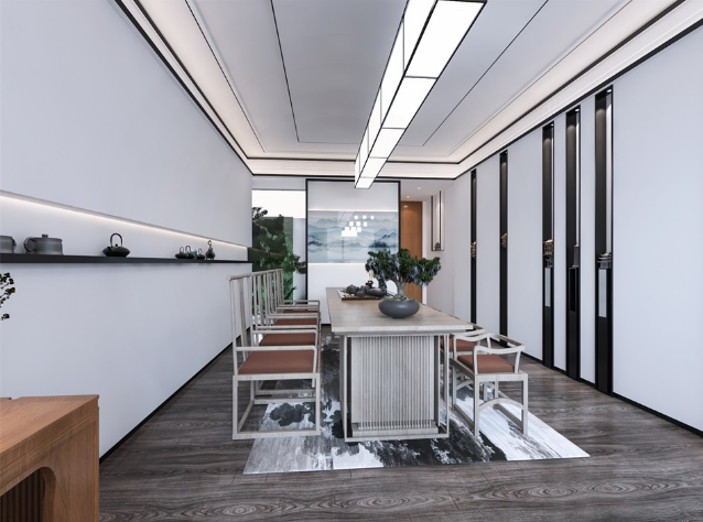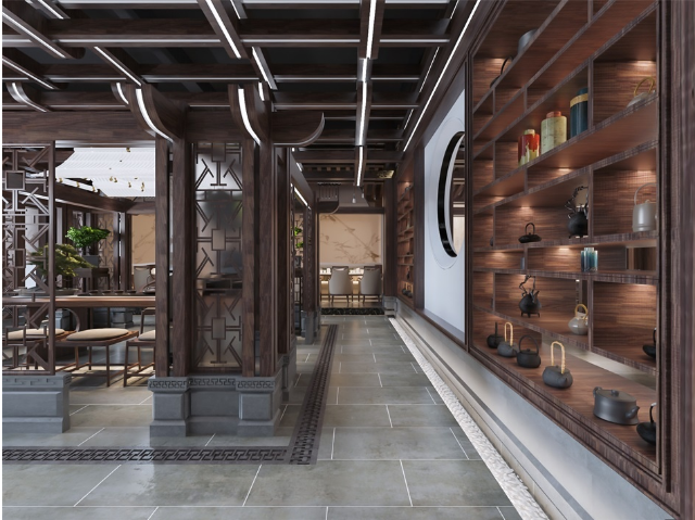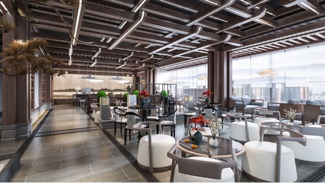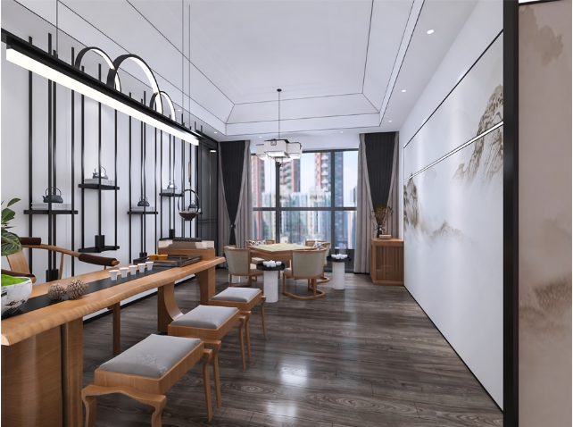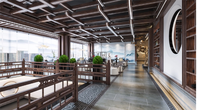 本案是一家中式禪意茶樓,整體風(fēng)格利用棕色搭配白色色調(diào),來凸顯中式格調(diào),結(jié)合古典裝飾元素,來表現(xiàn)中國風(fēng)。