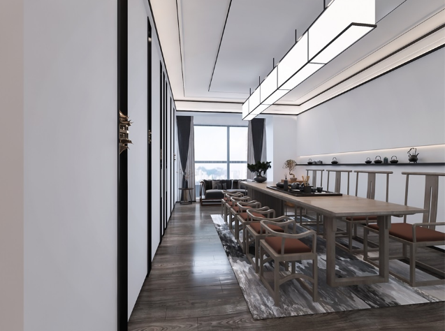 大面積落地玻璃將自然光引入室內(nèi),使得室內(nèi)寬敞明亮,使用局部燈光照明,視覺效果上增加了空間的層次感。干練的硬裝彰顯豪邁的氣派,白凈優(yōu)雅的軟裝則體現(xiàn)極簡的中國風(fēng)茶室。