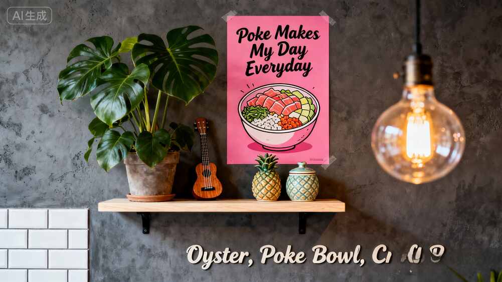 墻上那張海報才是靈魂所在!"Poke Makes My Day Everyday"這句話簡直寫到打工人心坎里了,配上誘人的波奇碗圖片,看著就讓人食欲大開。右上方那個復(fù)古燈泡更是點睛之筆,暖黃光線灑下來,連水泥墻都變得溫柔起來。