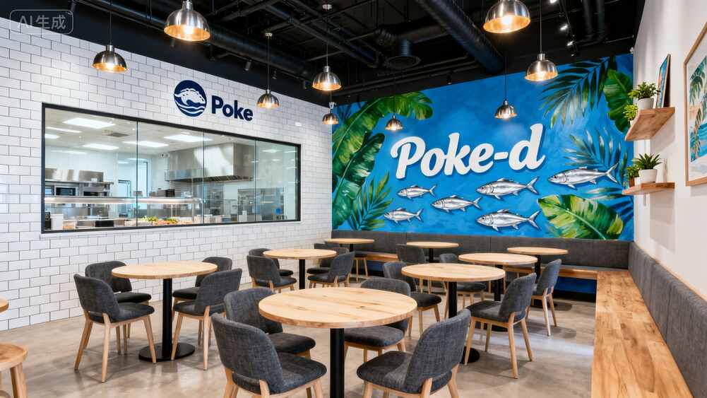 “Poke-d”的logo用簡約白色字母掛在墻上,底下一條大魚從字母間游過,配上翠綠棕櫚葉和波紋線條,瞬間把空間打開了好幾個層次。關(guān)鍵是這種壁畫成本比硬裝改造低多了,但效果***震撼——顧客進(jìn)門***眼就被抓住,手機不自覺就舉起來拍照了!