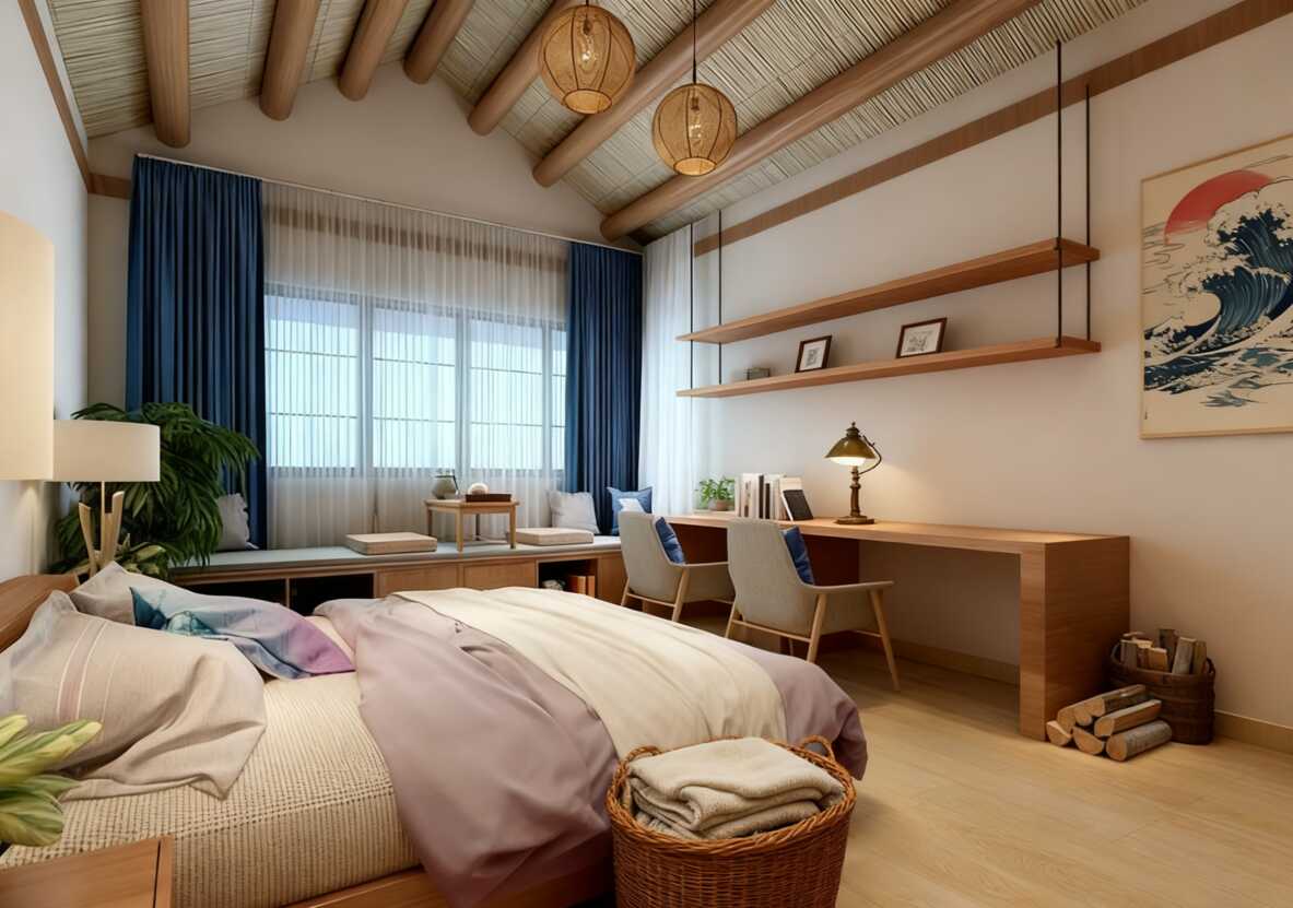 日式混搭風(fēng)民宿軟裝設(shè)計絕了!深藍(lán)簾 + 浮世繪 + 藤編燈,住進來就像闖進文藝電影場景
