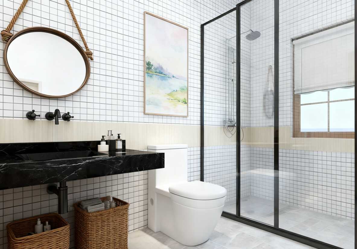 被問爆的民宿浴室軟裝設(shè)計!黑白格 + 藤編筐 + 藝術(shù)畫,洗澡都像在逛藝術(shù)展
