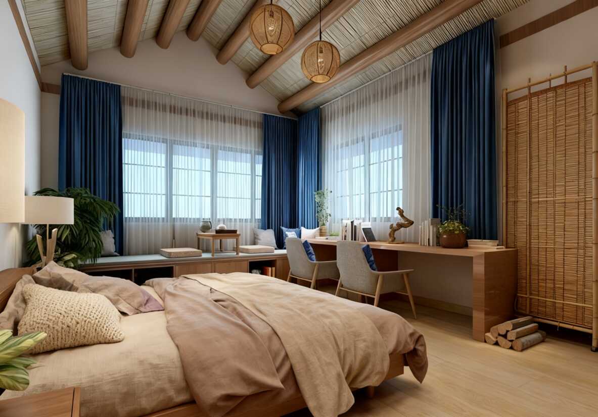 新中式侘寂風(fēng)民宿軟裝設(shè)計殺瘋了!藍白木三色碰撞,住進來就想賴到退房