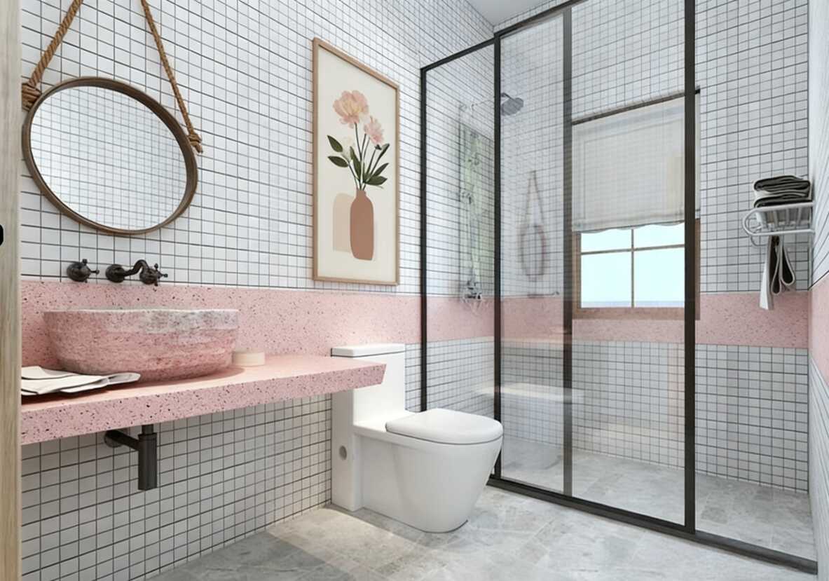 少女心暴擊!這家民宿浴室軟裝設(shè)計太會了,粉白格紋 + 復(fù)古細節(jié),洗澡都像在打卡