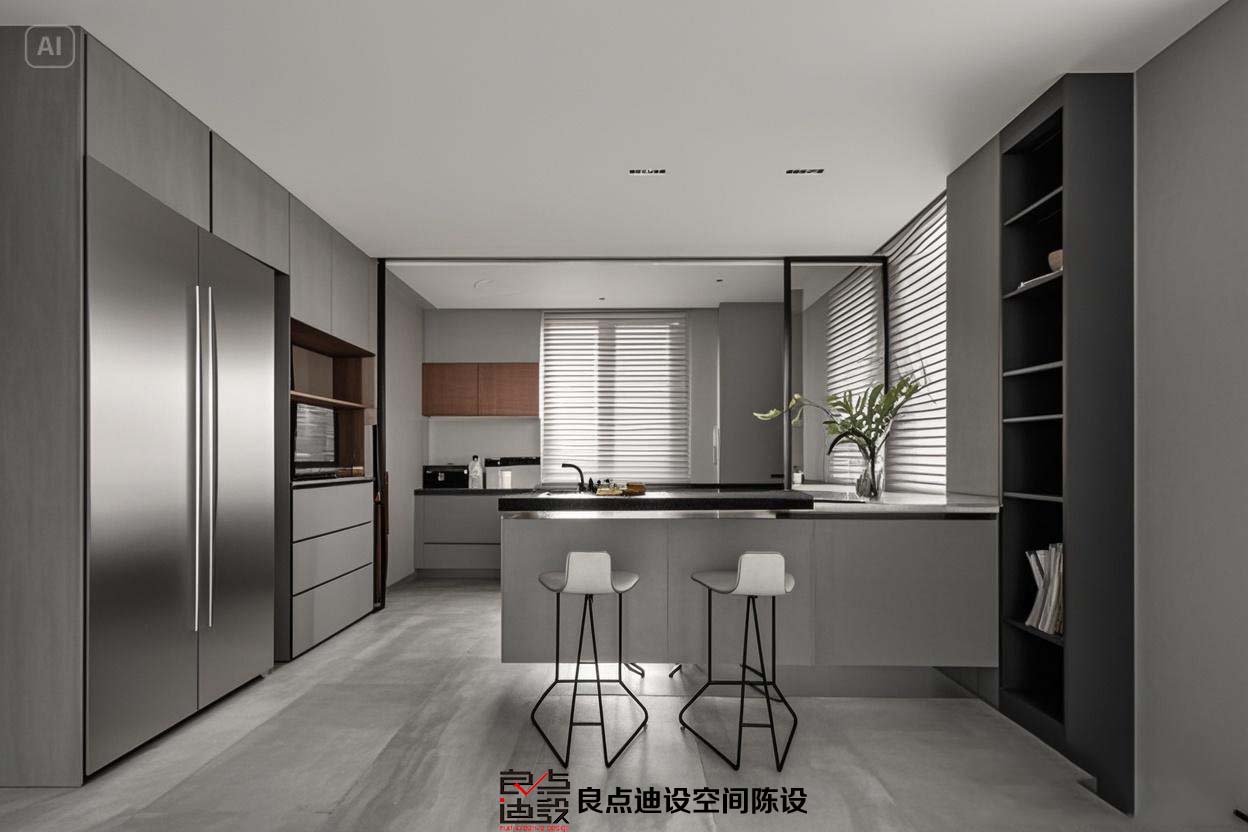 廚房以使用功能為主,頂面為石膏板吊頂,櫥柜采用鏡面烤漆咖色柜門,乳白色大理石臺面,咖色的地磚很耐臟。