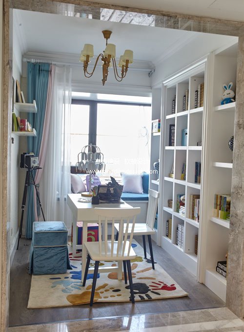 在家庭室里孩子們?cè)谶@里寫(xiě)字畫(huà)畫(huà),父母一起陪伴孩子做手工閱讀圖書(shū),陪伴他們的成長(zhǎng)。書(shū)柜里擺放男主人的收藏和兒童書(shū)籍,還有家庭溫馨的旅游照片和孩子們的手工,讓人感受到家的溫馨。