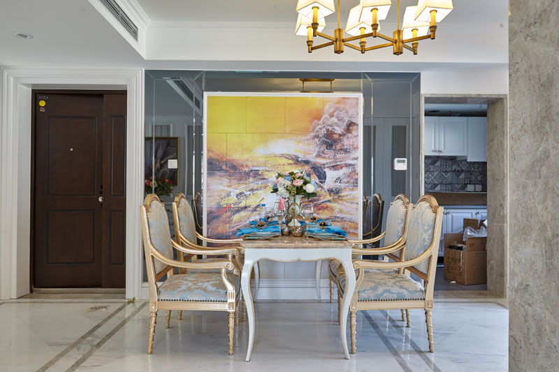 告別城市喧囂,剛從國(guó)外出差回來(lái)女主人就飛似的回到千般思念的家,脫下高跟鞋換上舒適優(yōu)雅的絲綢刺繡家居拖鞋,玄關(guān)處是她精心挑選的白色描金玄關(guān)柜,墻上懸掛著一幅她在法國(guó)小畫(huà)廊里淘回來(lái)的精致掛畫(huà),兩邊的壁燈與精致的水晶吊燈相互呼應(yīng)折射出七彩光芒,女主人將鑰匙放到小瓷盒里便向餐廳望去。
