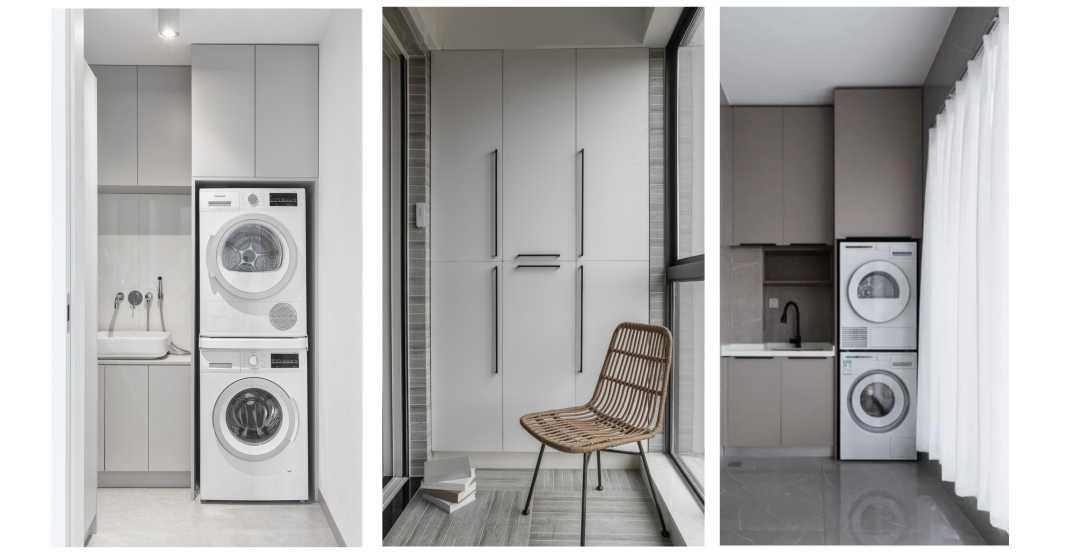 陽(yáng)臺(tái)很重要的一個(gè)功能就是洗衣晾曬,因此洗衣機(jī),烘干機(jī),洗衣臺(tái)面都是必不可少,生活比較小資的業(yè)主,可以在陽(yáng)臺(tái)定做一個(gè)卡座或者放幾把椅子還有一個(gè)小圓桌,趁著周末約幾個(gè)好友閑坐喝茶聊天,也是非常愜意的。