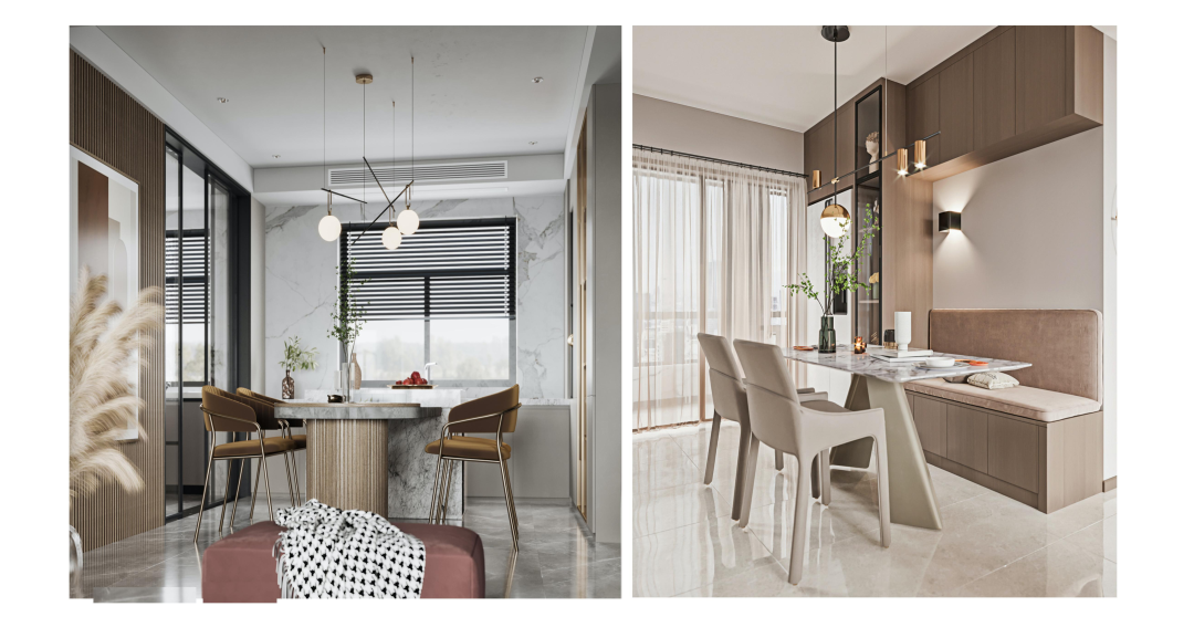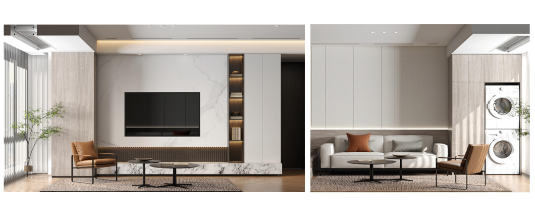 與***稿方案有所不同的是,將客廳陽(yáng)臺(tái)空間打通,整體空間更加開(kāi)闊;餐廳增加卡座,卡座一般靠墻或在角落,其占用空間比椅子少,必要時(shí)可以坐更多的人,還能增加收納空間。北次臥作為客臥,設(shè)計(jì)為榻榻米+衣柜+書(shū)桌結(jié)合的形式。
