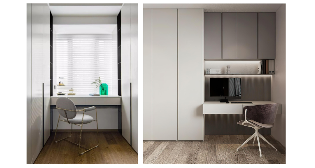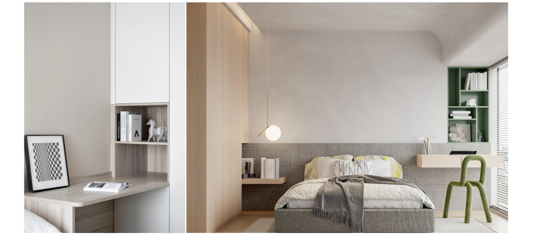 采用了書(shū)房與衣帽間一體化的設(shè)計(jì),同時(shí)滿(mǎn)足收納衣物與書(shū)籍的需求。窗邊的書(shū)桌引入了自然光,可兼作辦公桌與梳妝臺(tái),頗具匠心。