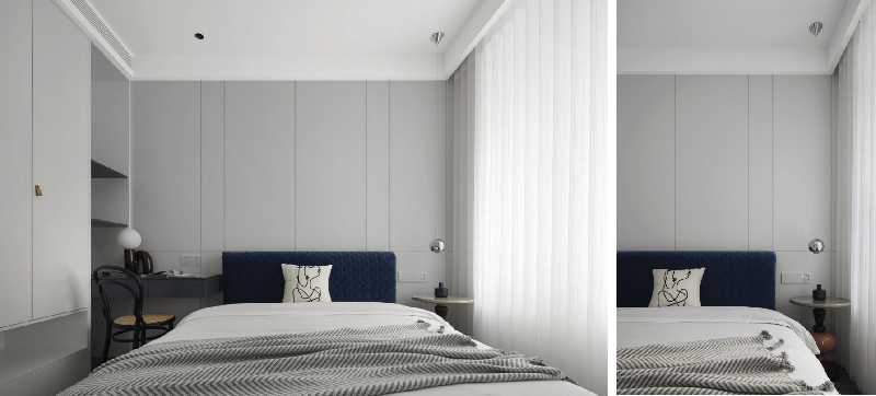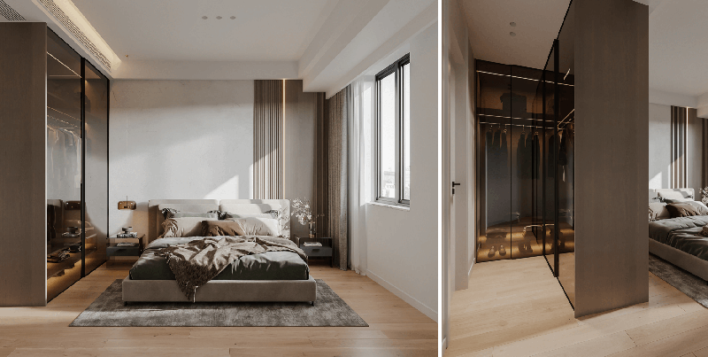 在房頂凹槽處做燈帶設(shè)計(jì)代替原有的主燈,實(shí)現(xiàn)極簡(jiǎn)大方的燈具設(shè)計(jì),讓整個(gè)房間簡(jiǎn)潔明亮,視覺(jué)上房間更加寬敞,L型透明衣柜,在臥室中形成了小型衣帽間,同時(shí)能作為隔斷,分隔洗浴區(qū)和睡眠區(qū),茶色的透明玻璃柜門提升空間的通透感,實(shí)用又高級(jí),拿取衣服更加方便,更有一種精致的高級(jí)感,讓衣柜中的衣服成為一種展示品,美觀與實(shí)用兼具。