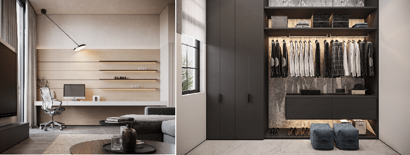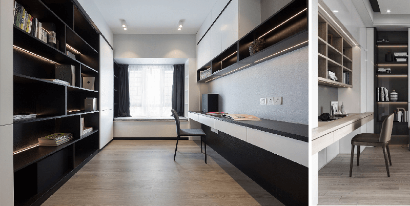 鑒于北次臥空間有限,將北次臥做書房+衣帽間二合一的設(shè)計(jì),一側(cè)做靠墻書桌,另一側(cè)做到頂衣柜設(shè)計(jì),學(xué)習(xí)儲(chǔ)物兩不誤,家中儲(chǔ)物空間充足時(shí),可以將衣柜改造成整墻的書籍收納,將整個(gè)空間變成書房,空間獨(dú)立不受打擾。