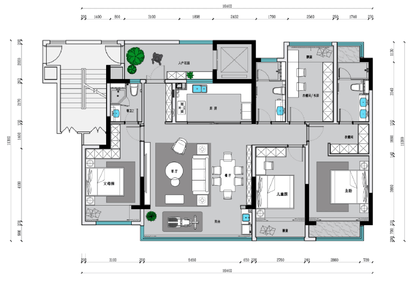 四間臥室,三間朝南,采光充足,父母房中帶有獨(dú)立衛(wèi)浴,方便老人起夜,衛(wèi)生間更是要做適老化設(shè)計(jì),方便老人居住和使用,沿墻面定制的L型收納柜,***利用拐角空間,收納功能強(qiáng)大。兒童房帶有飄窗,視覺(jué)效果寬敞,改良采光,讓房間更加明亮,稍微裝飾下,鋪幾個(gè)蒲團(tuán),坐在午后的陽(yáng)光里,看書喝茶擼貓。主臥中L型衣柜設(shè)計(jì),形成獨(dú)立的小型衣帽間,浴室中兩個(gè)盥洗盆設(shè)計(jì),方便男女主人早上上班時(shí),不會(huì)出現(xiàn)匆忙爭(zhēng)搶的現(xiàn)象。朝北臥室設(shè)計(jì)成衣帽間和書房,解決家中收納問(wèn)題,同時(shí)也提供了獨(dú)立安靜的學(xué)習(xí)工作空間。